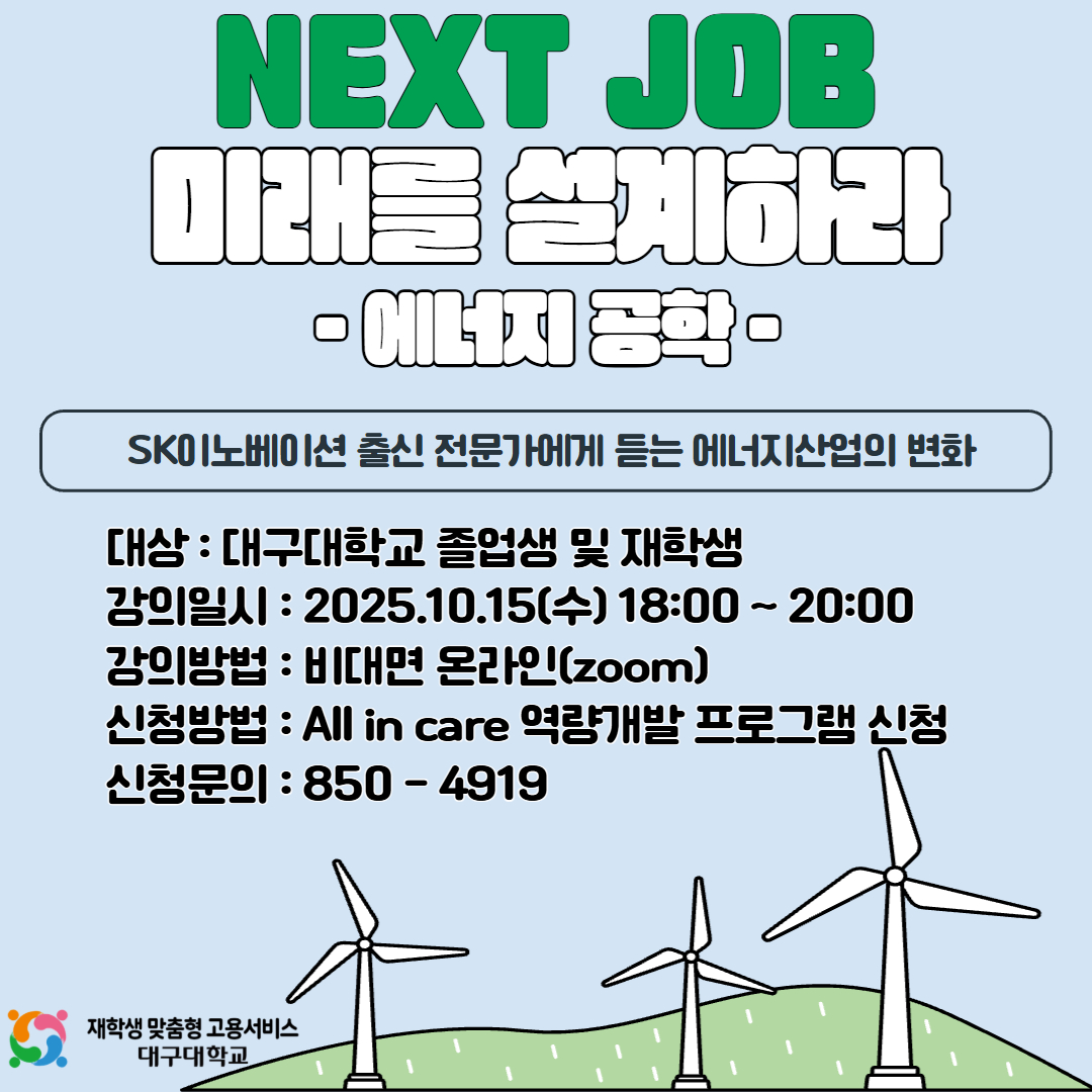 일정 | 시간 | 구분 | 세부내용 | 10/15 (수) | 18:00~20:00 (2시간) | NEXT JOB, 미래를 설계하라-에너지공학분야 | - 에너지 산업의 변화 - 차세대 에너지(신재생, 폐기물 외) 핵심기술 - 에너지공학 주요진출 분야, 핵심역량 |