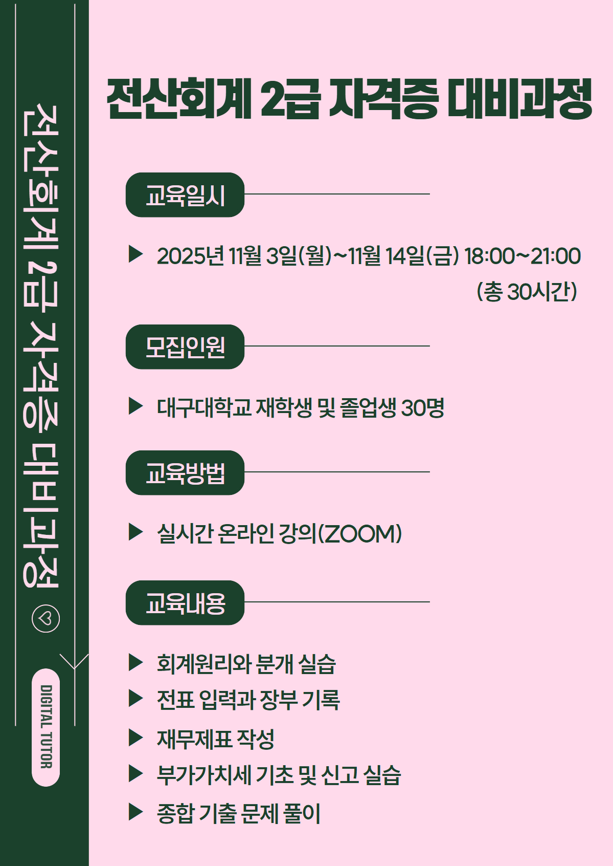 프로그램 상세일정 회차 | 일정 | 시간 | 내용 | 세부내용 | 강사 | 1 | 11/3(월) | 18:00~21:00 (3h) | 회계기초 | -회계의 개념과 목적 -회계의 분류(재무회계/관리회계 외) -기업 회계의 기본 구조 및 거래의 이해 | 안철선 | 2 | 11/4(화) | 18:00~21:00 (3h) | 회계원리와 분개 실습 | -계정과목의 이해 -차변과 대변 개념 -복식부기와 분개 작성 방법 | 3 | 11/5(수) | 18:00~21:00 (3h) | 전표 입력과 장부 기록 | -전산회계 프로그램 소개 및 기본 사용법 -전표 입력 실습(일반 거래 사례 중심) -총계정원장 및 보조장부 이해 | 4 | 11/6(목) | 18:00~21:00 (3h) | 결산 개요 및 기말 수정분개 | -결산의 의미와 절차 -기말 수정분개(감가상각, 대손충당금 등) -결산정리분개 실습 | 5 | 11/7(금) | 18:00~21:00 (3h) | 재무제표 작성 (1) | -재무상태표 작성 원리 -손익계산서 작성 원리 -프로그램 활용 재무제표 출력 및 해석 | 6 | 11/10(월) | 18:00~21:00 (3h) | 재무제표 작성 (2) | -자본변동표, 현금흐름표 기초 -기업 재무제표 사례 분석 -전산회계 프로그램 활용 실습 | 7 | 11/11(화) | 18:00~21:00 (3h) | 부가가치세 (VAT) 기초 | -부가가치세의 개념 및 구조 -매출세액, 매입세액 이해 -전자세금계산서 처리 및 신고 기초 | 8 | 11/12(수) | 18:00~21:00 (3h) | 부가가치세 신고 실습 | -부가가치세 신고서 작성 절차 -전산회계 프로그램을 통한 부가가치세 입력 및 출력 실습 | 9 | 11/13(목) | 18:00~21:00 (3h) | 종합 기출 풀이 | -기출문제 유형 분석 -회계 기초 → 분개 → 결산 → 재무제표 → 부가세 흐름 정리 | 10 | 11/14(금) | 18:00~21:00 (3h) | 종합 문제 풀이 | -프로그램 실습 중심 종합 문제 풀이 |