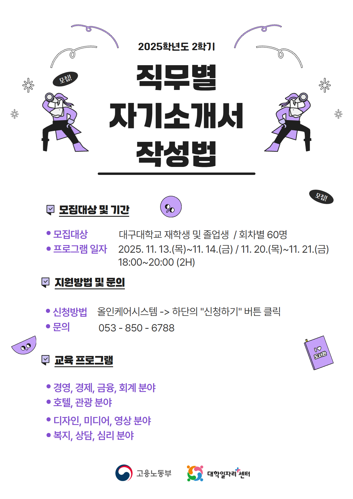 일정 | 시간 | 구분 | 세부내용 | 11/13(목) | 18:00~20:00 (2h) | 경영, 경제, 금융, 회계 분야 | - 주요 직무 소개 및 필요 역량 이해 - 기술 경험과 문제 해결 중심 작성법 - AI활용 자기소개서 항목 및 내용 분석 경제/금융 등 관련 필수 자격증 | 11/14(금) | 18:00~20:00 (2h) | 호텔, 관광 분야 | - 직무별 전문 지식과 경험 정리법 - AI활용 자기소개서 항목 및 내용 분석 - 전공 역량 강조하는 작성 전략 호텔, 관광 인턴 경험 | 11/20(목) | 18:00~20:00 (2h) | 디자인, 미디어, 영상 분야 | - 디자인, 미디어, 영상분야 필요 역량 이해 - 나에게 필요한 포트폴리오 작성법 - AI활용 자기소개서 항목 및 내용 분석 | 11/21(금) | 18:00~20:00 (2h) | 복지, 상담, 심리 분야 | - 복지, 상담, 심리분야 핵심역량 - 직무에 맞는 자기소개서 작성법 - AI활용 자기소개서 항목 및 내용 분석 필수 자격증 정리 |