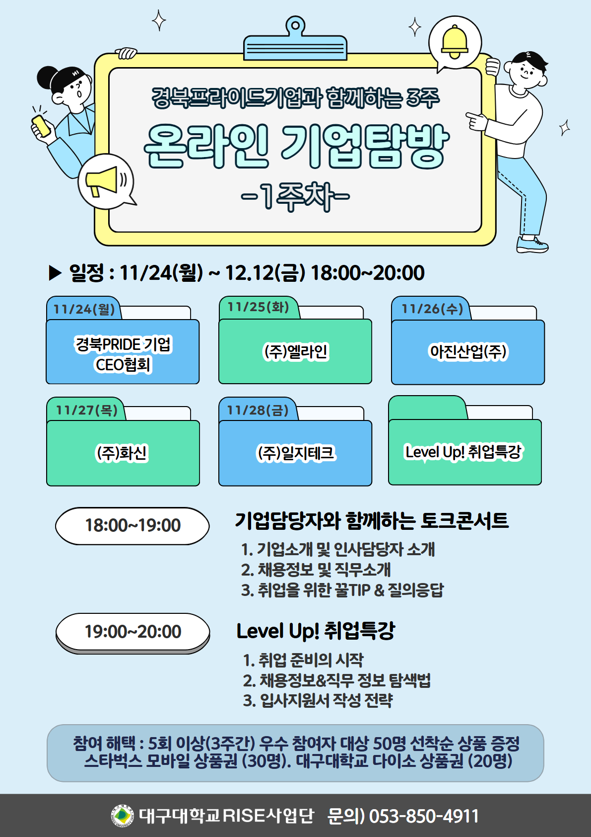★1주차 특강 안내★ ○ 운영일정 : 11.24(월) ~11.21(금) 18:00~20:00 (2H) ○ 운영방식 : 현직자 토크콘서트 + 취업특강 ○ 토크콘서트 상세일정 11/24 월 | 11/25 화 | 11/26 수 | 11/27 목 | 11/28 금 | 경북PRIDE 기업 CEO협회 | ㈜엘라인 | 아진산업(주) | ㈜화신 | ㈜일지테크 |