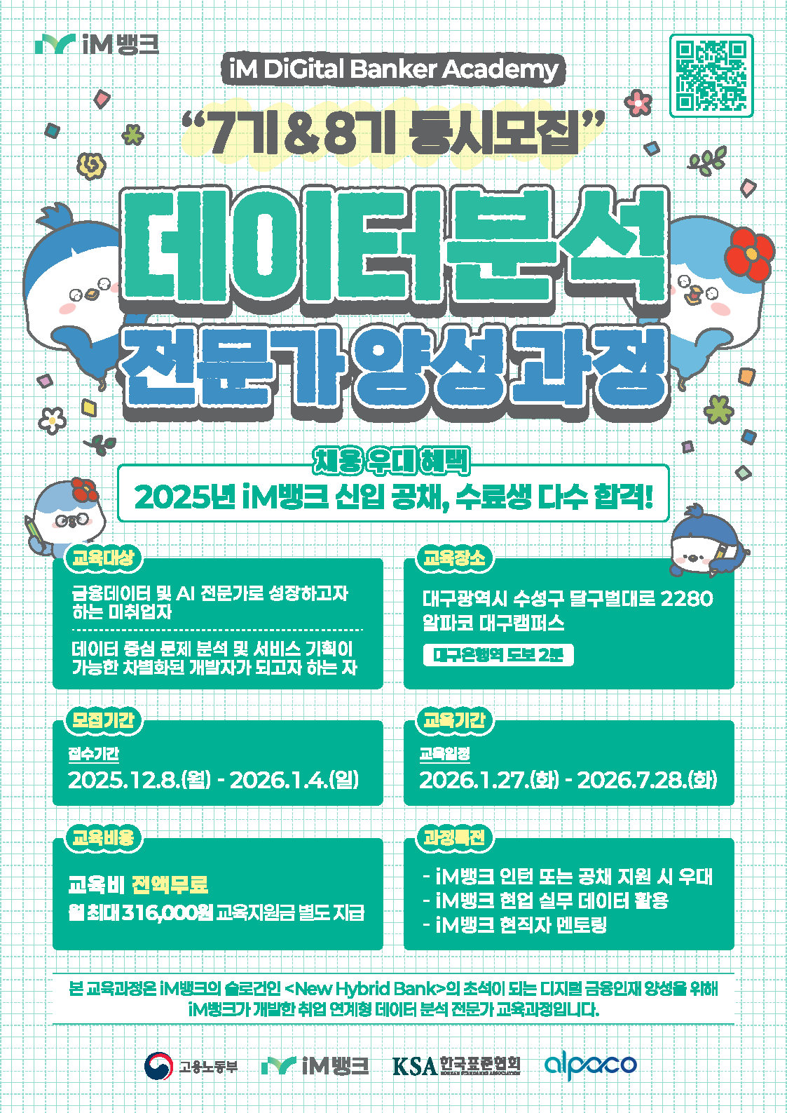 ▶모집기간 : 25.12.8(월) ~26.1.4(일) ▶ 운영기간 : 26.1.27(화) ~ 26.7.28(화) ▶ 교육장소 : 대구광역시 수성구 달구벌대로 2280 알파코 대구캠퍼스(대구은행역 도보 2분) ▶ 교육비 전액 무료 ▶ 교육대상 1. 금융데이터 및 AI 전문가로 성장하고자 하는 미취업자 2. 데이터 중심 분제 분석 및 서비스 기획이 가능한 차별화된 개발자가 되고자 하는자 ▶모집대상 : 졸업예정자 or 졸업생 ▶과정특권 - IM뱅크 인턴 또는 공채 지원 시 우대 - IM뱅크 현업 실무 데이터 활용 - IM뱅크 현직자 멘토링 ▶신청방법 : QR코드 신청 > 취업 All in care 온라인 접수(로그인 후 우측 하단 신청하기 클릭)