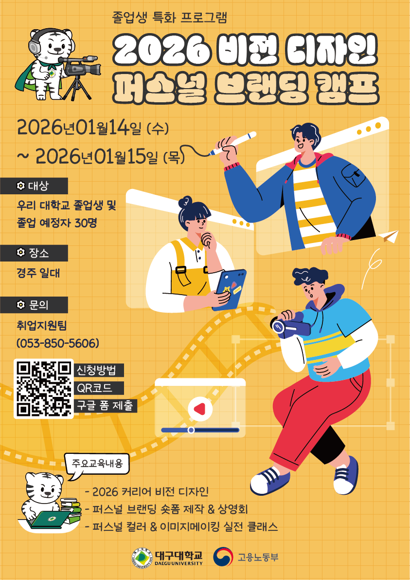 ▶일 정 : 26.01.14(수) ~ 26.01.15(목) ▶장 소 : 경주 마우나오션리조트 ▶신청방법 : 구글폼 신청(https://forms.gle/kjjsuajEd29uZbUh8) ▶문 의 : 053-850-5606 / 채널 (대구대학교_대학일자리플러스센터)