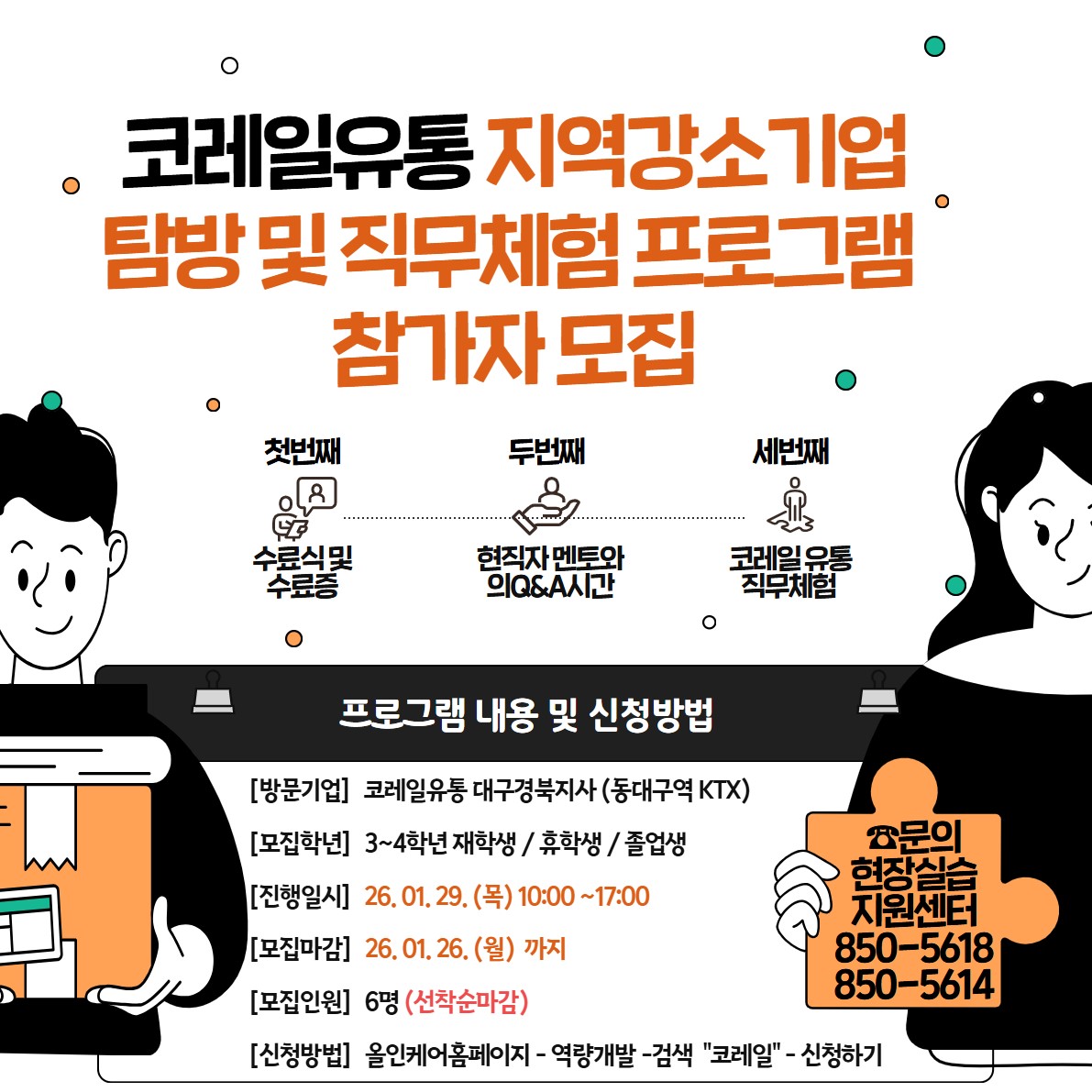 1. 행사개요 가. 방문기업 : 코레일유통 대구경북지사(동대구역 KTX) 나. 모집학년 : 4학년 재학생 / 휴학생 / 졸업생 ★공공기관 취업을 준비하는 학생 또는 관심이 있는 학생들 다. 진행일시 : 2026.01.29.(목) 10:00 ~ 17:00 라. 모집날짜 : 2026.01.26(월)까지! 마. 모집인원 : 6명 (빠른 모집으로 마감 시, 조기 종료됨 / 지원자 통화 후 최종 합격 안내) 바. 신청방법 : 올인케어홈페이지(http://job.daegu.ac.kr) -역량프로그램 선택 - 검색 제목명 "코레일"로 검색해서 나오는 프로그램 신청하기 클릭 - 비고란 지원동기 작성