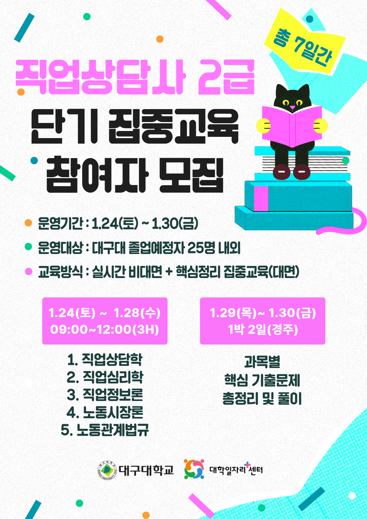 '직업상담사'를 꿈꾸며 자격증 준비 학생들을 위한 프로그램 * [비대면] 26.01.24~26.01.28 / 09:00~12:00 [3H] - 직업상담학, 직업심리학, 직업정보론, 노동시장론, 노동관계법규 이론 * [대면] 26.01.29~26.01.30 / 1박 2일 (경주 더케이 호텔) - 과목별 핵심 기출문제 및 총정리 풀이