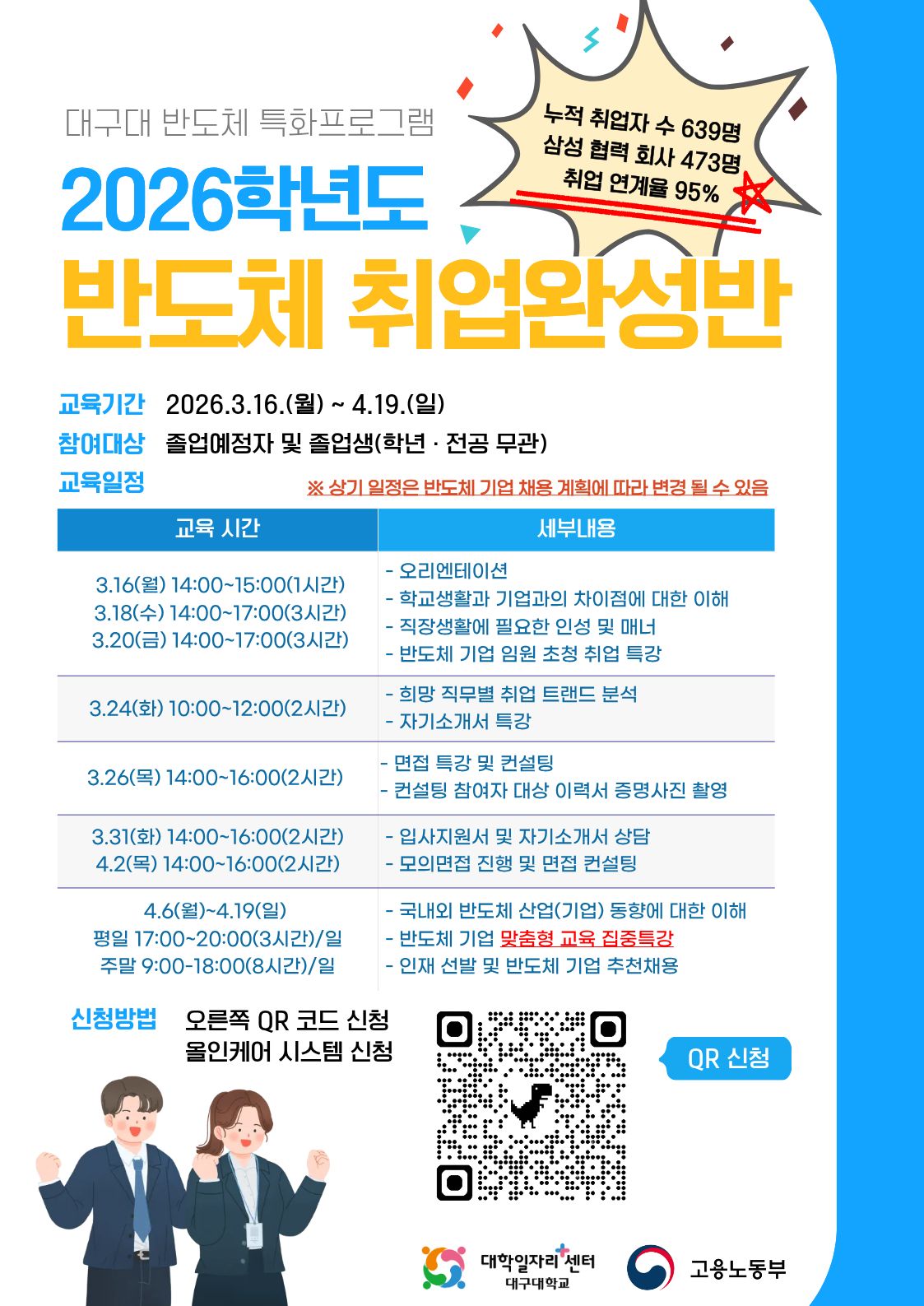 [프로그램 개요] 1. 프로그램명 : 2026학년도 제 2기 반도체 취업 완성반 2. 프로그램 세부 내용 가. 운영 일시 : 2026. 03. 16.(월) ~ 4. 19.(일) 나. 운영 방법 : OT비대면 외에 진로취업관 대면으로 진행됩니다 다. 참여 대상 : 대구대학교 재학, 졸업생 및 지역청년 라. 프로그램 일정 : 구글 폼으로 신청 3. 신청 방법 : QR또는 구글폼으로 신청