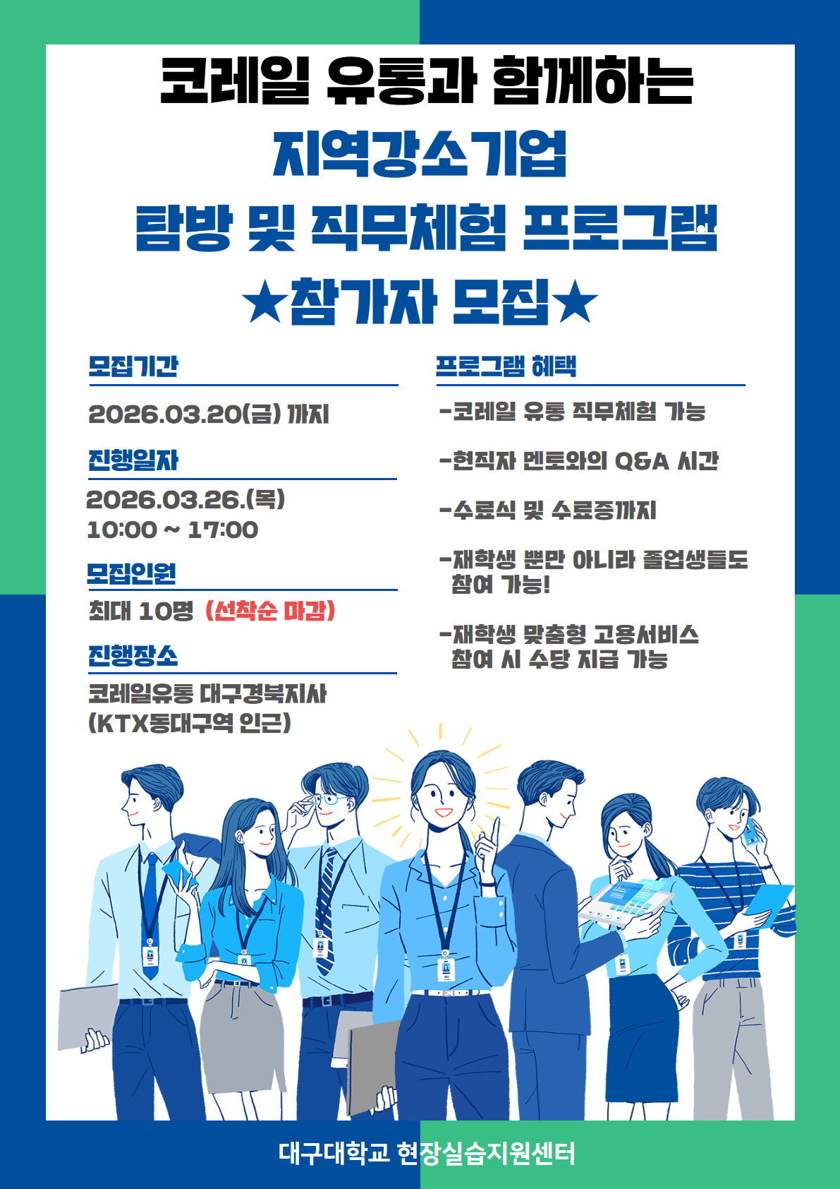 1. 행사개요 가. 방문기업 : 코레일유통 대구경북지사(동대구역 KTX) 나. 모집학년 : 4학년 재학생 / 휴학생 / 졸업생 ★공공기관 취업을 준비하는 학생 또는 관심이 있는 학생들 다. 진행일시 : 2026.03.26.(목) 10:00 ~ 17:00 라. 모집날짜 : 2026.03.20(금)까지! 마. 모집인원 : 10명 (빠른 모집으로 마감 시, 조기 종료됨 / 지원자 통화 후 최종 합격 안내) 바. 신청방법 : 올인케어홈페이지(http://job.daegu.ac.kr) -역량프로그램 선택 - 검색 제목명 "코레일"로 검색해서 나오는 프로그램 신청하기 클릭 - 비고란 지원동기 작성