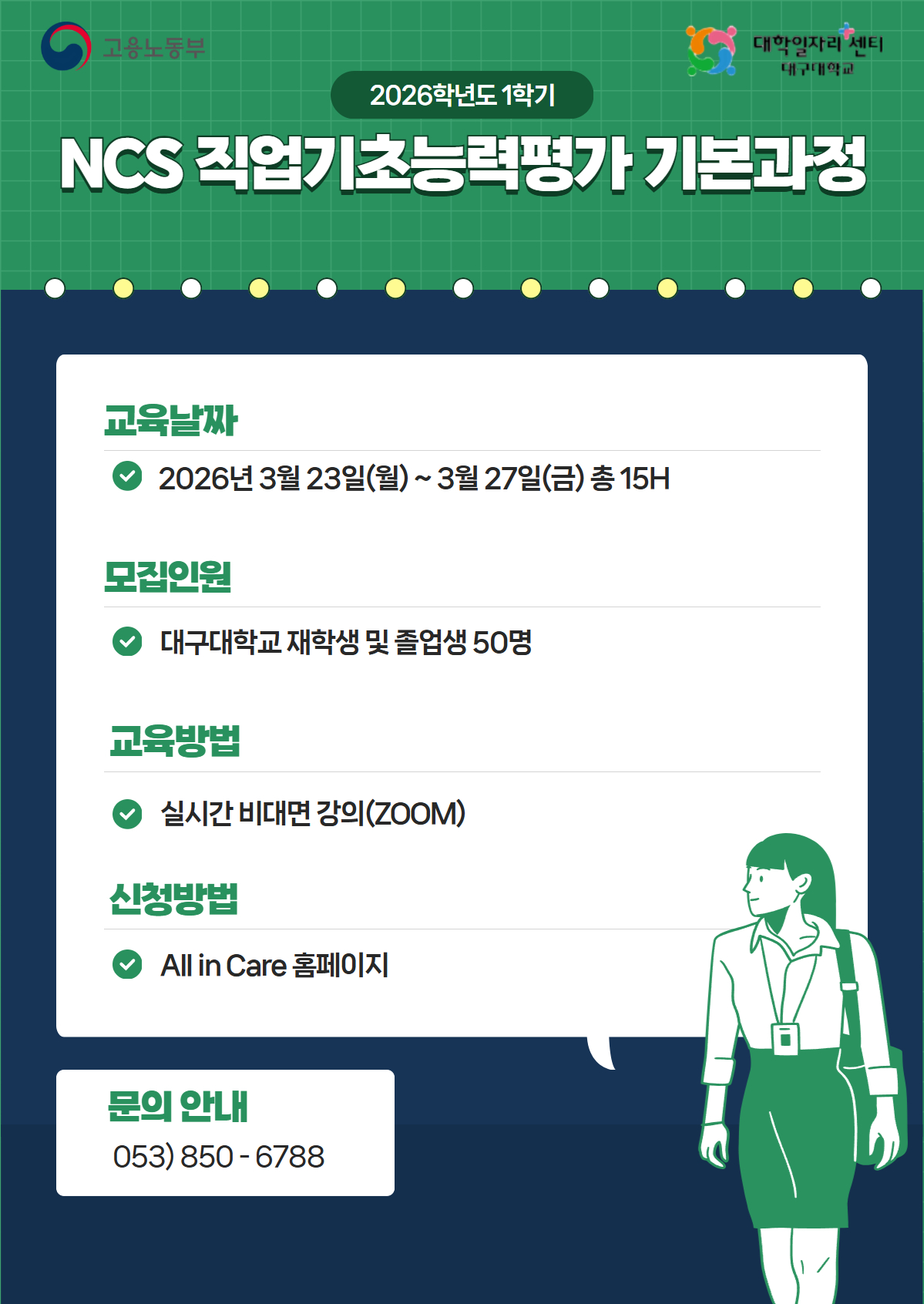 * 참가신청 : 우측 하단 '신청하기' 클릭 * 커리큘럼 80% 이하 참여 시, 미이수처리 * 신청 후 변동사항 (수강 취소 등) 3/20(금) 17시 전까지 꼭 알려주세요!!! * 문의 : 053-850-6788