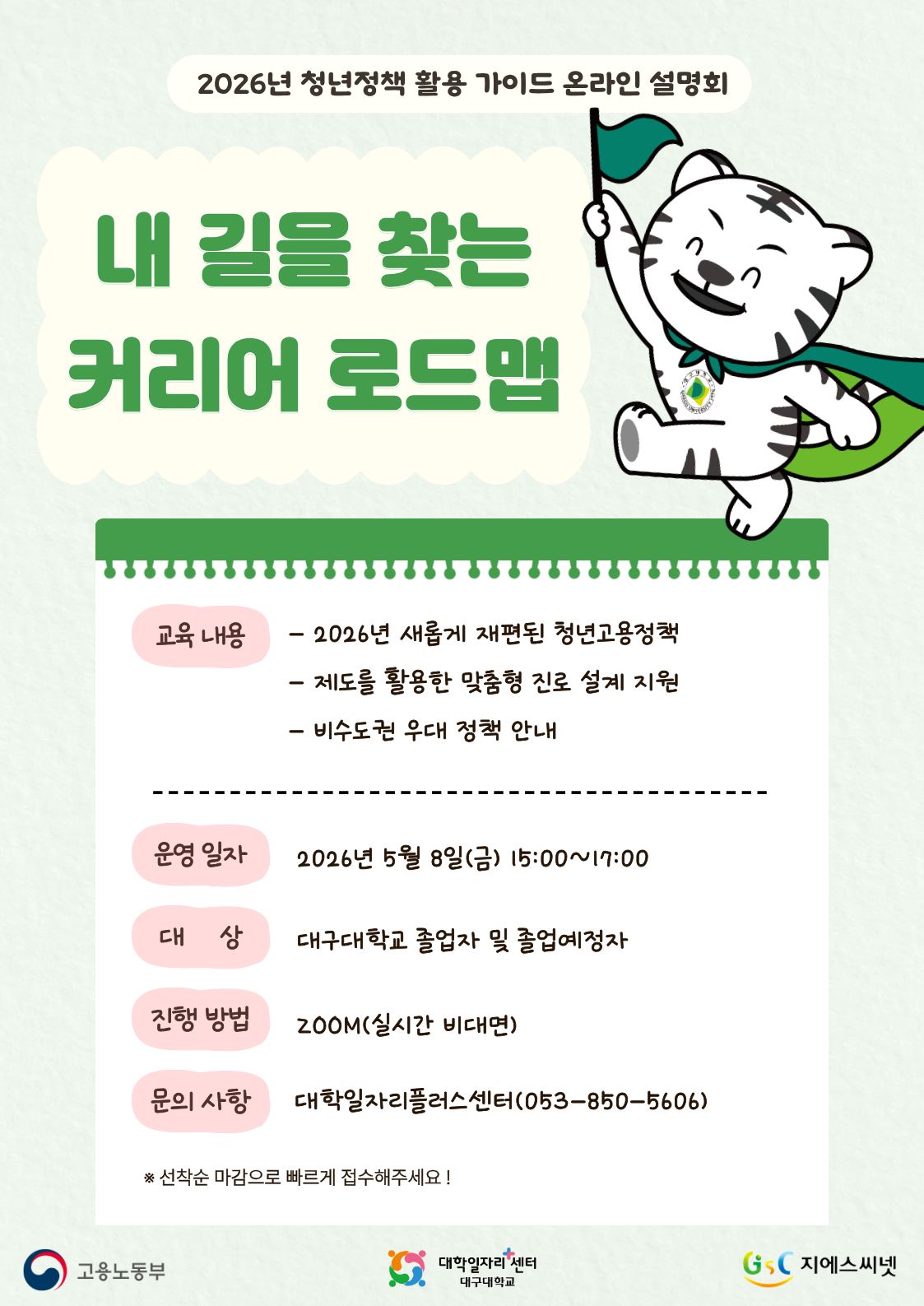 가. 프로그램명: [졸특]내 길을 찾는 커리어 로드맵: 2026 청년정책 활용 가이드 나. 교육일시: 1회차) 2026.03.24.(화) 15:00~17:00 2회차) 2026.05.08.(금) 15:00~17:00 3회차) 2026.06.23.(화) 15:00~17:00 4회차) 2026.08.19.(수) 15:00~17:00 5회차) 2026.09.08.(화) 15:00~17:00 다. 교육대상: 졸업생 및 졸업예정자, 지역청년 라. 교육방법: 실시간 온라인(ZOOM) 교육 마. 프로그램 개요 - 2026 국민취업지원제도 안내(개편 반영) - 청년미래적금, 청년일자리도약장려금(지역특화) 안내 - 청년 국가기술자격 응시료 지원사업 안내 - 청년월세지원, 청년도전지원사업 안내 - 청년정책을 활용한 구직 성공 사례 공유 바. 구글폼 신청(https://forms.gle/YeXJ9HHUckAzMJSi8)