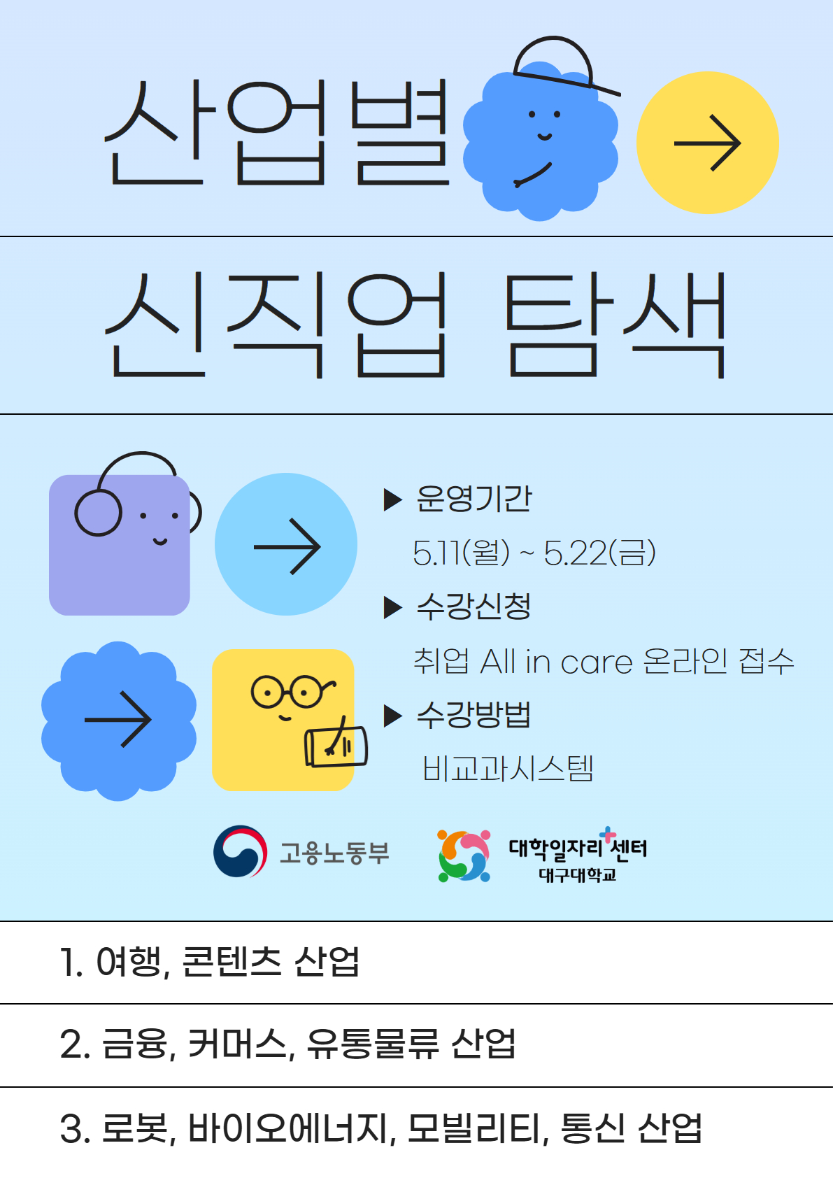 가. 프로그램명 : [청년미래직진] 산업별 신직업 탐색 온라인 특강 프로그램 나. 운영기간 : 2026.05.11(월)~2025.05.22(금) (2H) 다. 사업대상 : 대구대학교 재학생 라. 운영방법 : 비대면 온라인 강의(*비교과시스템 영상 탑재) 바. 이수방법 : 비교과 시스템 온라인 강의 이수 (80%이상) 사 . 교육내용 1. 여행, 콘텐츠 산업의 신직업 탐색 2. 금융, 커머스, 유통문류 산업의 신직업 탐색 3. 로봇, 바이오에너지, 모빌리티, 통신 산업의 신직업 탐색