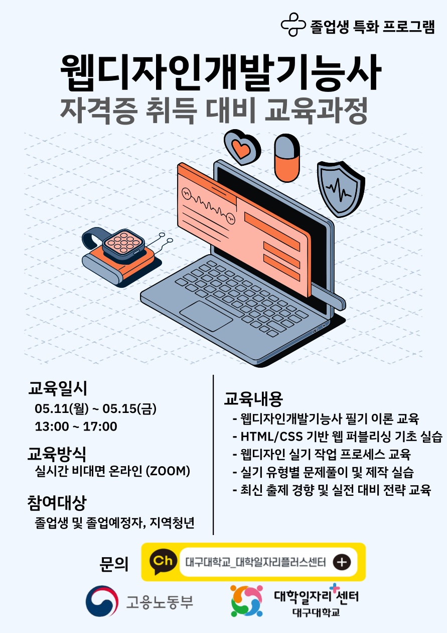 가. 프로그램명: 웹디자인개발기능사 자격증 취득 대비 교육과정 나. 교육일시 : 2026. 05. 11.(월) ~ 05. 15.(금) 13:00~17:00 (5일, 총 20H) 다. 교육방식 : 실시간 온라인 라이브(ZOOM) 라. 참여대상 : 졸업생 및 졸업예정자, 지역청년 ( 선착순 마감 예정 )