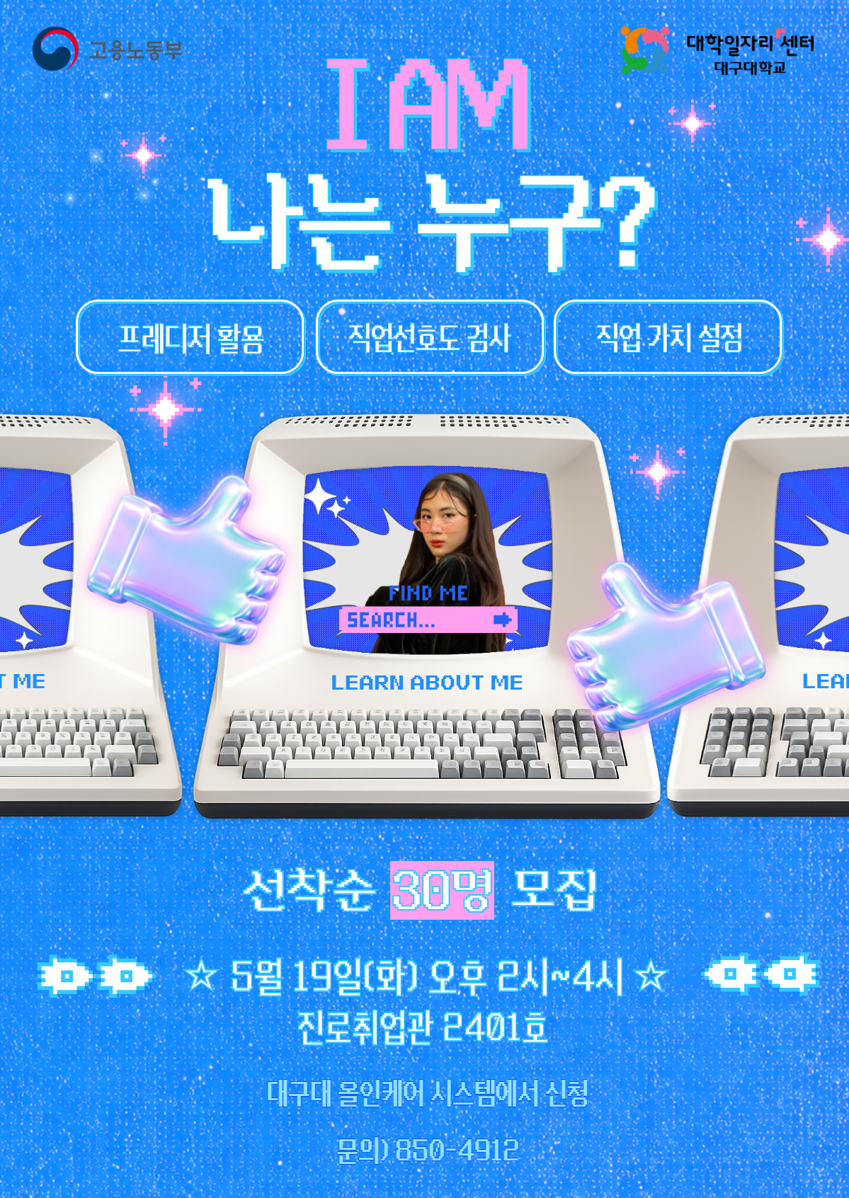 1. 프로그램명: I AM 나는 누구? 2. 교육일시 : 2026. 5. 19.(화) 14:00~16:00(2H) 3. 교육대상 : 대구대학교 재학생 30명 4. 교육장소 : 진로취업관 4층 2401호 5. 교육방법 : 실시간 대면 강의 6. 신청방법 : AII in care 홈페이지를 통한 온라인 접수
