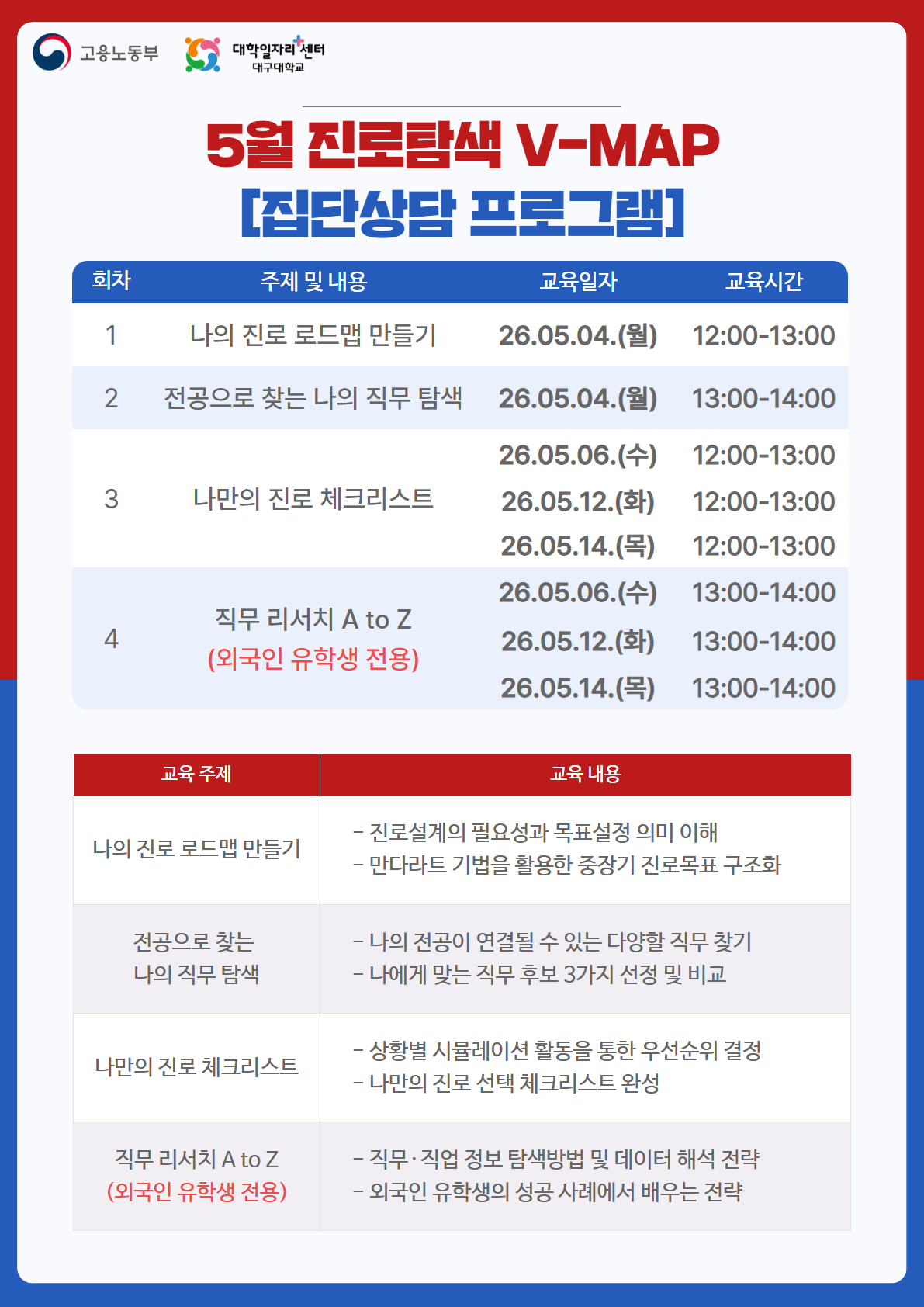 구분 | 교육 주제 | 교육 일자 | 교육 시간 (시수) | 목표설정 | 나의 진로 로드맵 만들기 | 05월 04일 | 12:00~13:00 (1) | 진로탐색 | 전공으로 찾는 나의 직무 탐색 | 05월 04일 | 13:00~14:00 (1) | 의사결정 | 나만의 진로 체크리스트 | 05월 06일 | 12:00~13:00 (1) | 05월 12일 | 12:00~13:00 (1) | 05월 14일 | 12:00~13:00 (1) | 진로정보 [외국인 유학생 전용] | 직무리서치 A to Z | 05월 06일 | 13:00~14:00 (1) | 05월 12일 | 13:00~14:00 (1) | 05월 14일 | 13:00~14:00 (1) |