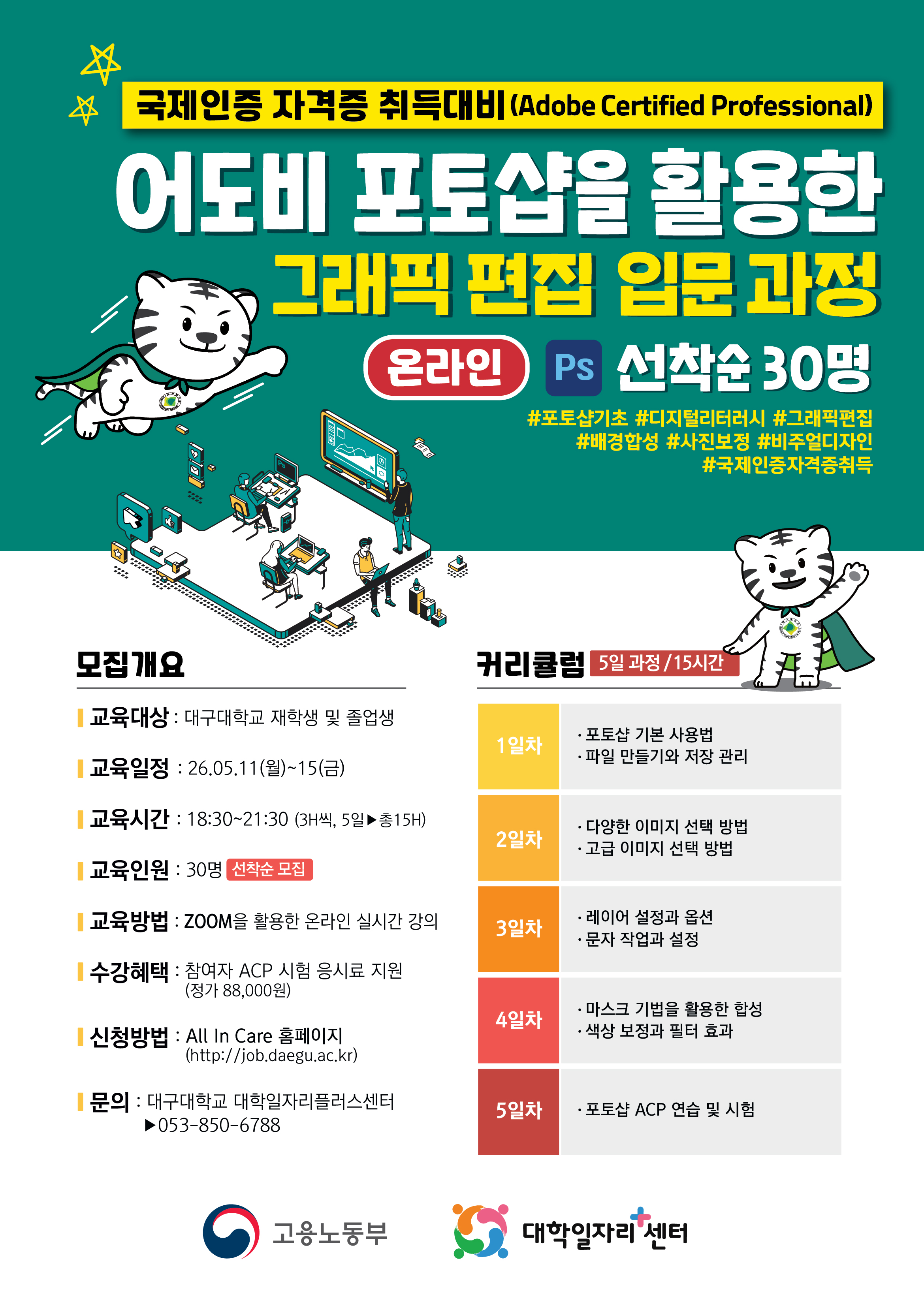 프로그램 상세내용 교육일시 | 세부 교육내용 | 5/11(월) 18:30~21:30 (3시간) | Chapter1 : 포토샵 기본 사용법 Chapter2 : 파일 만들기와 저장 관리 Chapter3 : 다양한 이미지 선택 방법 | 5/12(화) 18:30~21:30 (3시간) | Chapter4 : 고급 이미지 선택 방법 Chapter5 : 레이어 설정과 옵션 | 5/13(수) 18:30~21:30 (3시간) | Chapter6 : 문자 작업과 설정 Chapter7 : 포토샵 편집 도구 활용 | 5/14(목) 18:30~21:30 (3시간) | Chapter8 : 벡터 도구 활용과 편집 Chapter9 : 레이어 스타일을 활용한 편집 Chapter10 : 마스크 기법을 활용한 합성 | 5/15(금) 18:30~21:30 (3시간) | Chapter11 : 색상 보정과 필터 효과 Chapter12 : ACP 연습 및 시험 응시 |