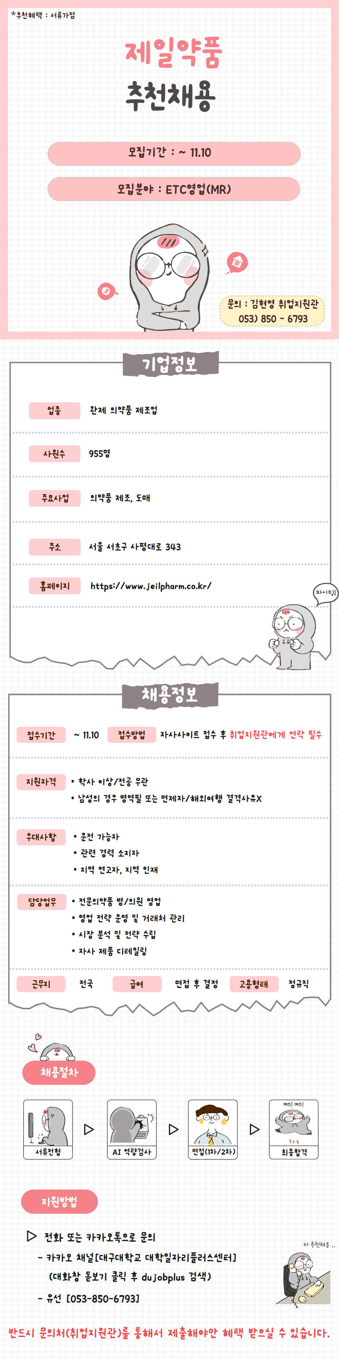 ![]() 대구대학교 대학일자리플러스 센터에서는 해당 채용 건에 대한 [자기소개서/면접] 맞춤형 컨설팅을 제공하고 있습니다. 필요하신 분들은 올인케어 시스템 상단의 상담신청 탭에서 예약이 가능하니 참고 바랍니다. |