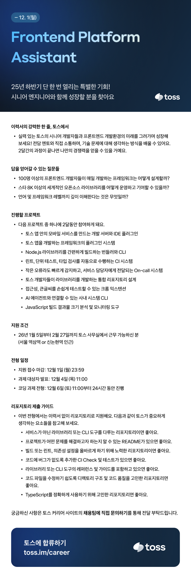 | 토스 25년도 2학기 Frontend Platform Assistant 모집 | |||