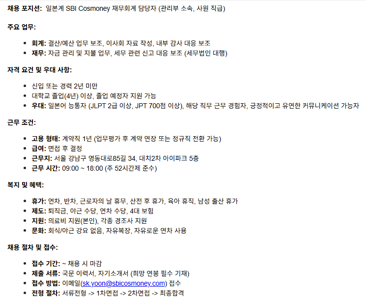 | [추천채용]SBI Cosmoney 재무회계 담당자 채용(일본계) | ||||