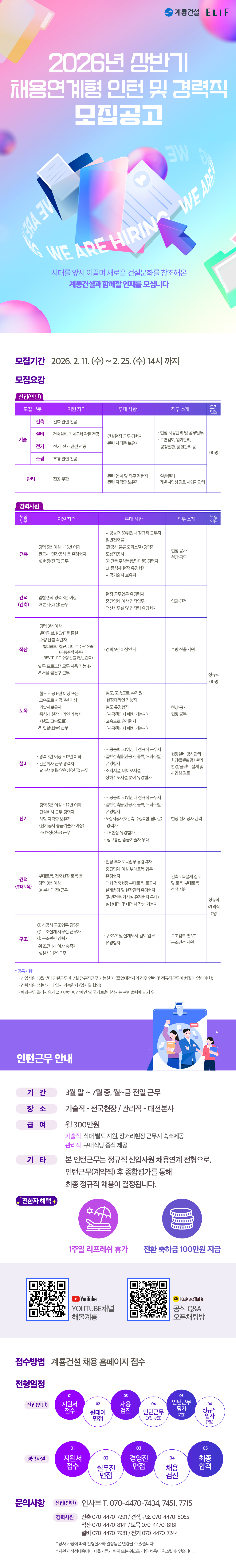 계룡건설 2026년 상반기 채용연계형 인턴 공개채용